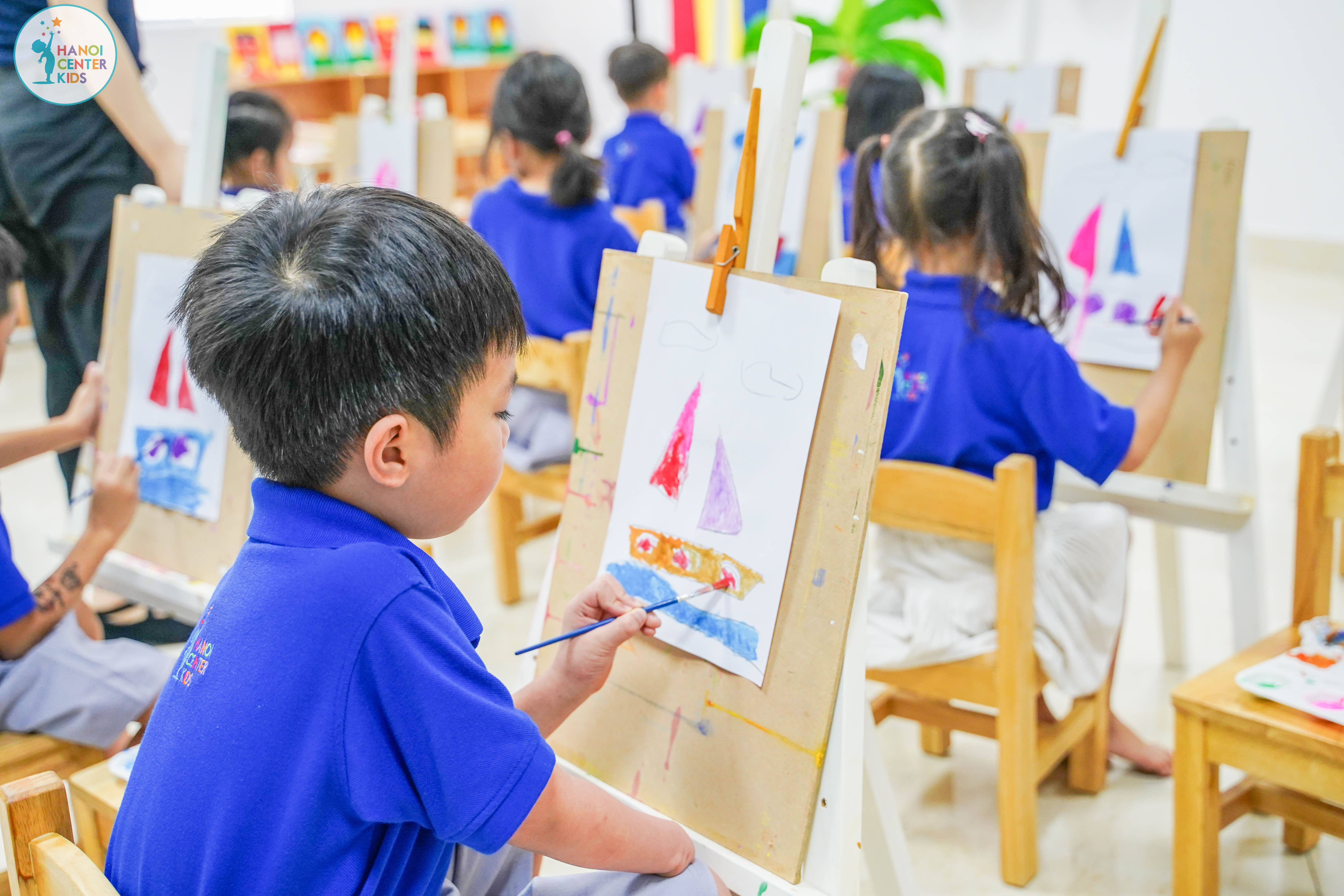 Phòng mỹ thuật tại trường Hanoi Center Kids là nơi nâng cao sự phát triển tiềm năng sáng tạo cho trẻ, tạo ra các điều kiện để trẻ tự thực hiện, tích cực tham gia vào các hoạt động tạo ra sản phẩm.